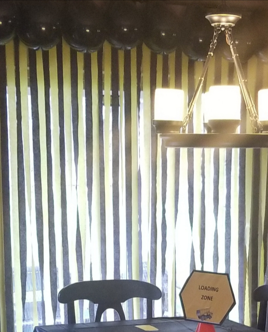 Do you have paper streamers laying around from old parties? If not head to the dollar tree and pick up a couple. I hung black and yellow streamers over the patio door and added black balloon along the top for another visual point of interest.